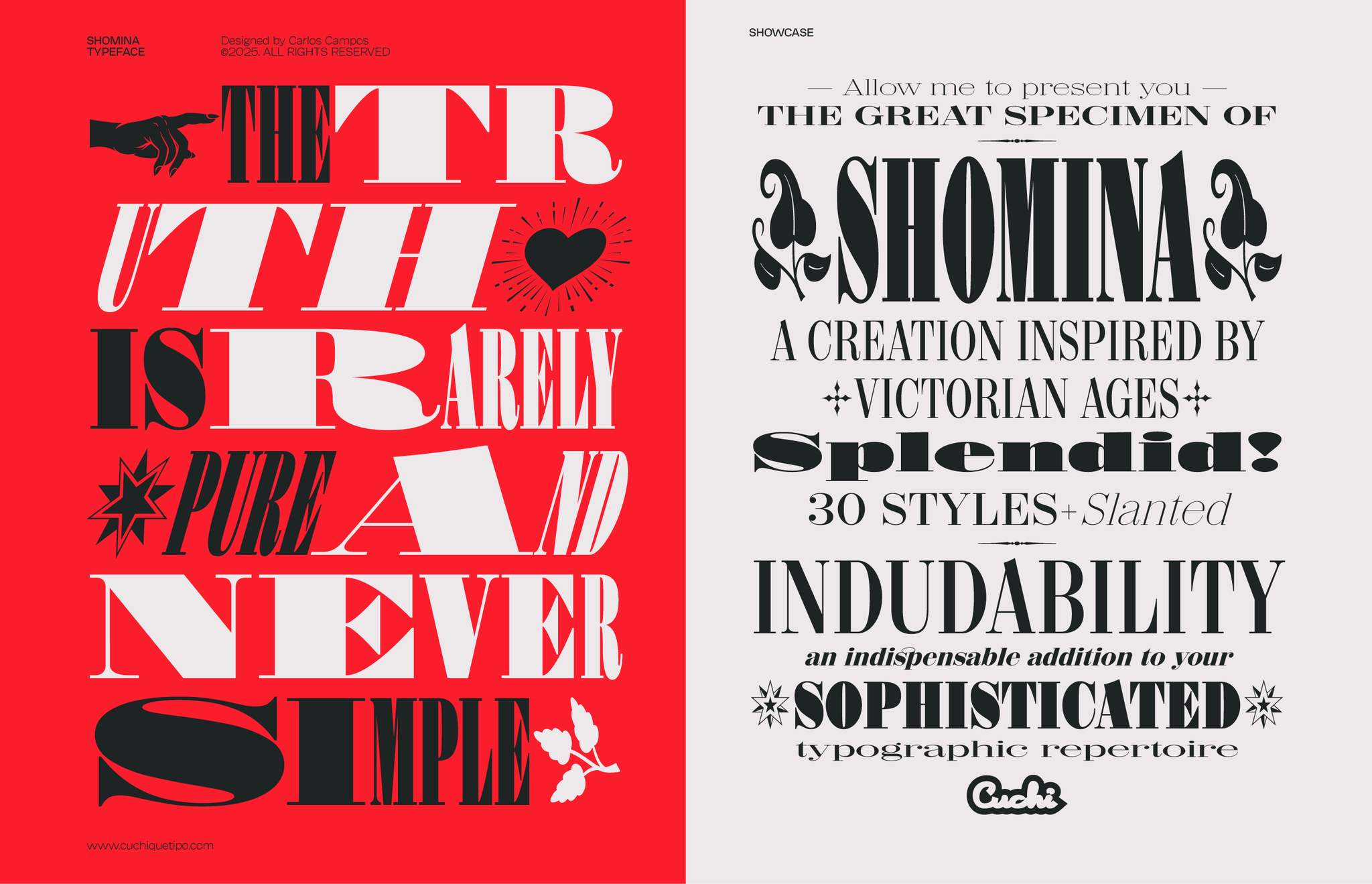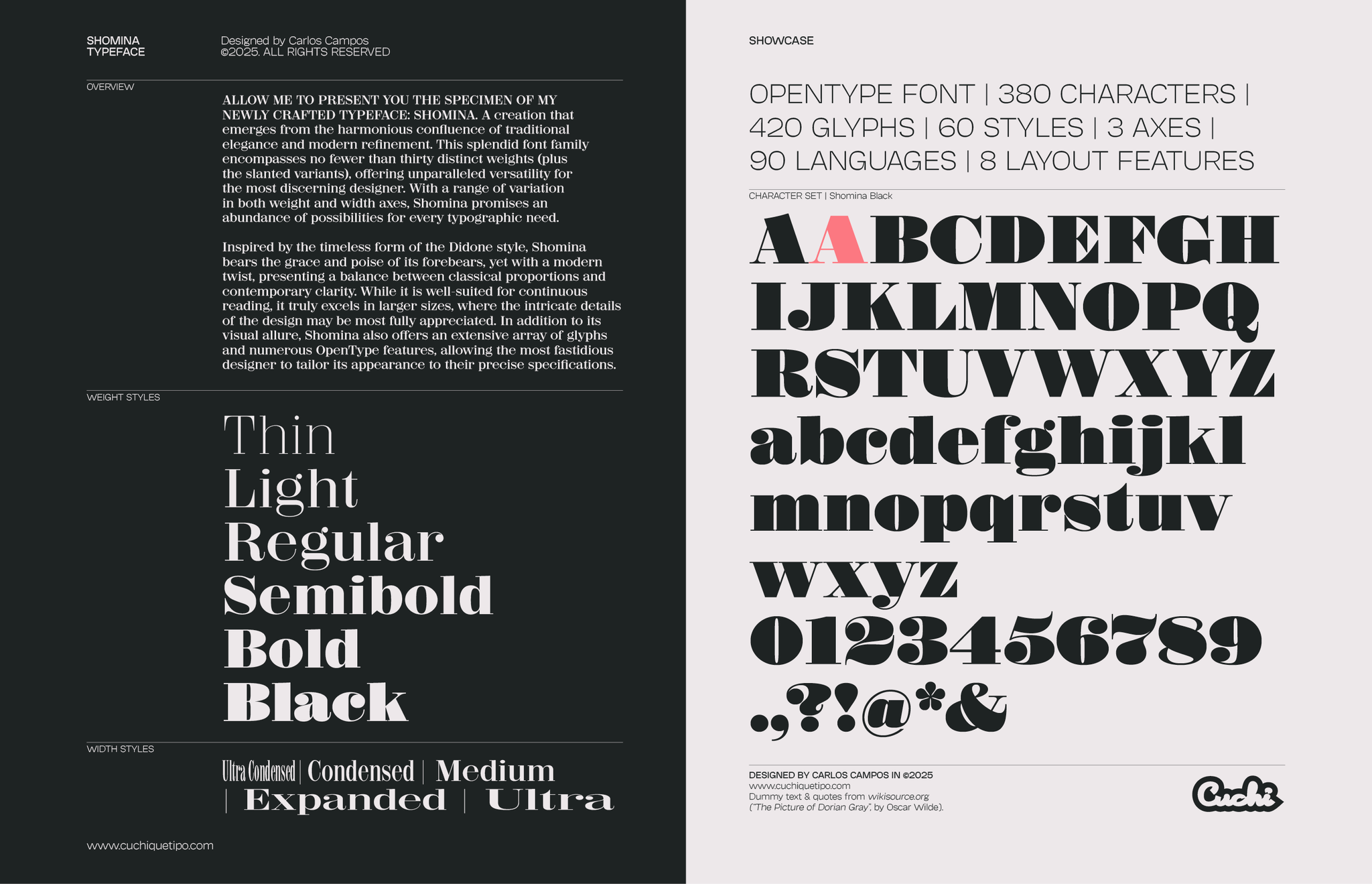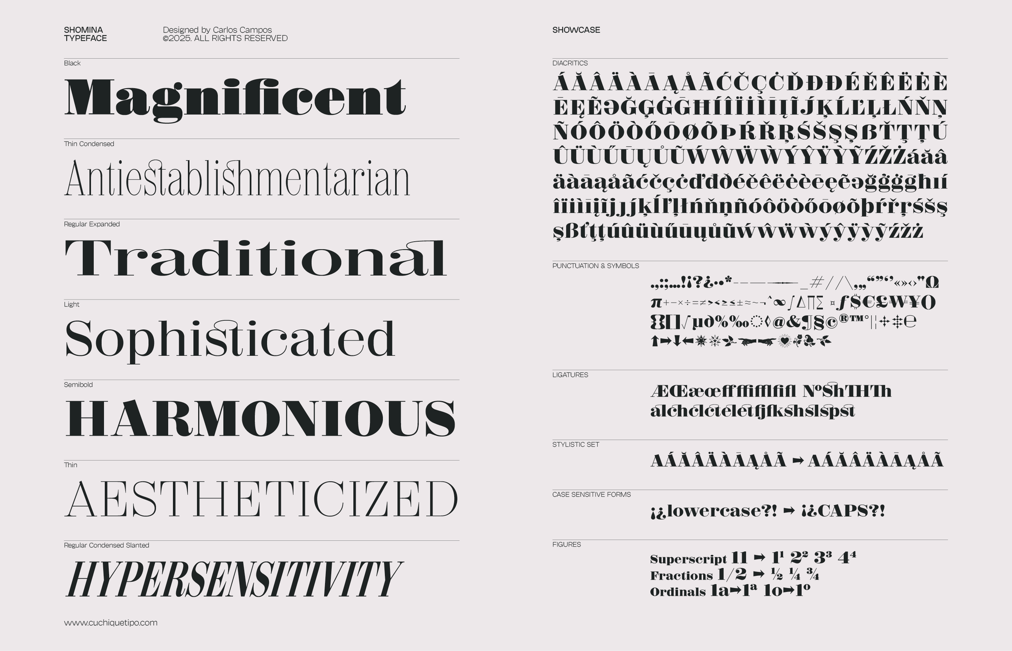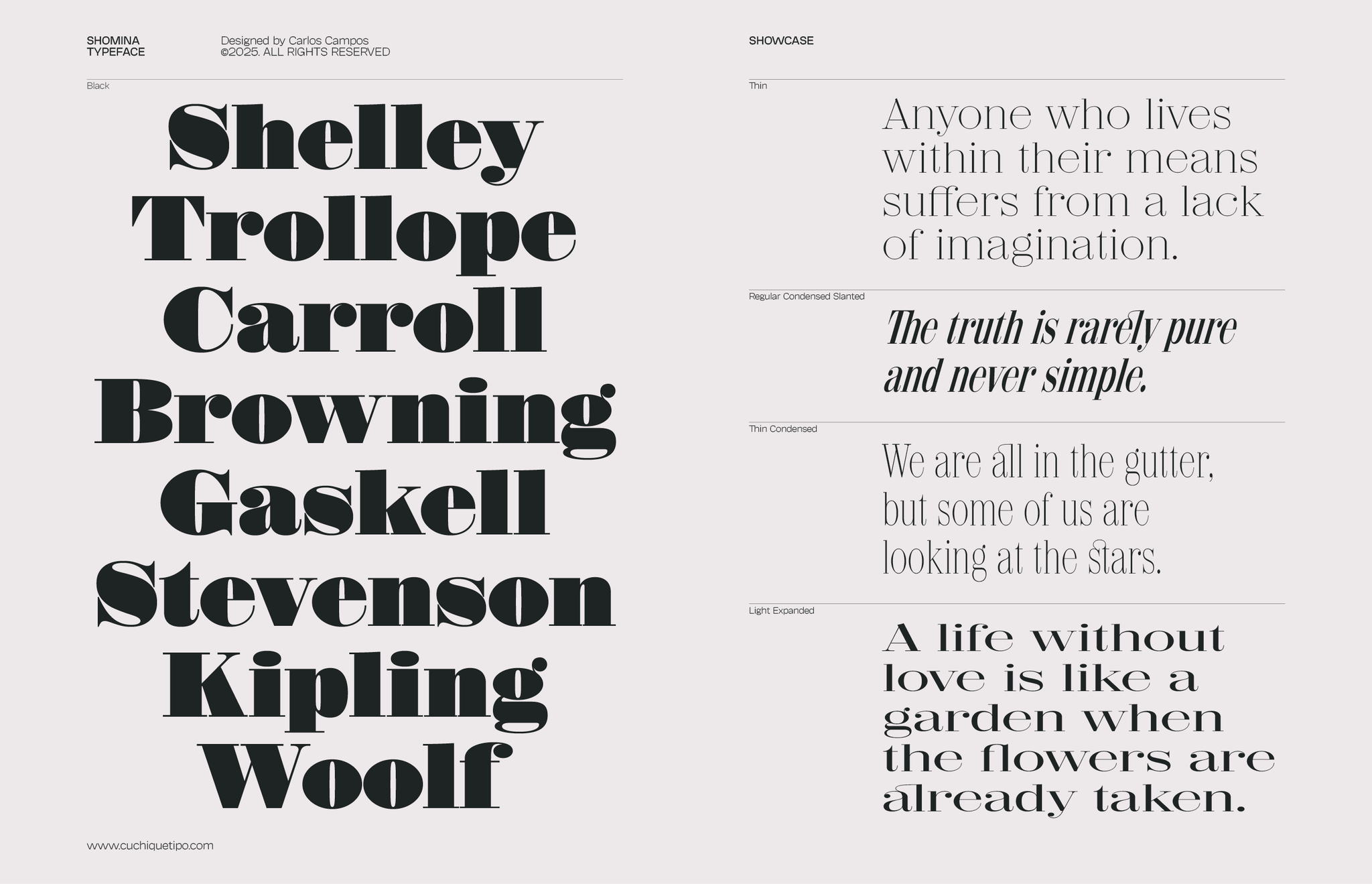 Allow me to present you the specimen of my newly crafted typeface: SHOMINA! A creation inspired by the timeless forms of the Didone style, that emerges from the harmonious confluence of traditional elegance and modern refinement. Shomina offers thirty distinct weights (plus the slanted variants), allowing the most fastidious designer to tailor its appearance to their precise specifications. I’m sure you shall find Shomina an indispensable addition to your typographic repertoire!